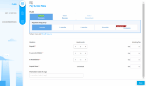 - For the trial, you can choose either the Premium Plan or the Express Plan. Select a headcount of 3 (note that for the Premium Plan, only a 1-month plan is available with a 3-headcount option).